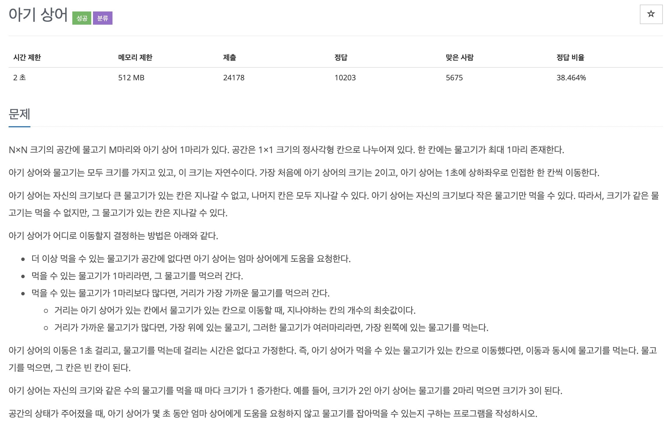 아기 상어는 자신의 크기와 같은 수의 물고기를 먹을 때 마다 크기가 1 증가한다.